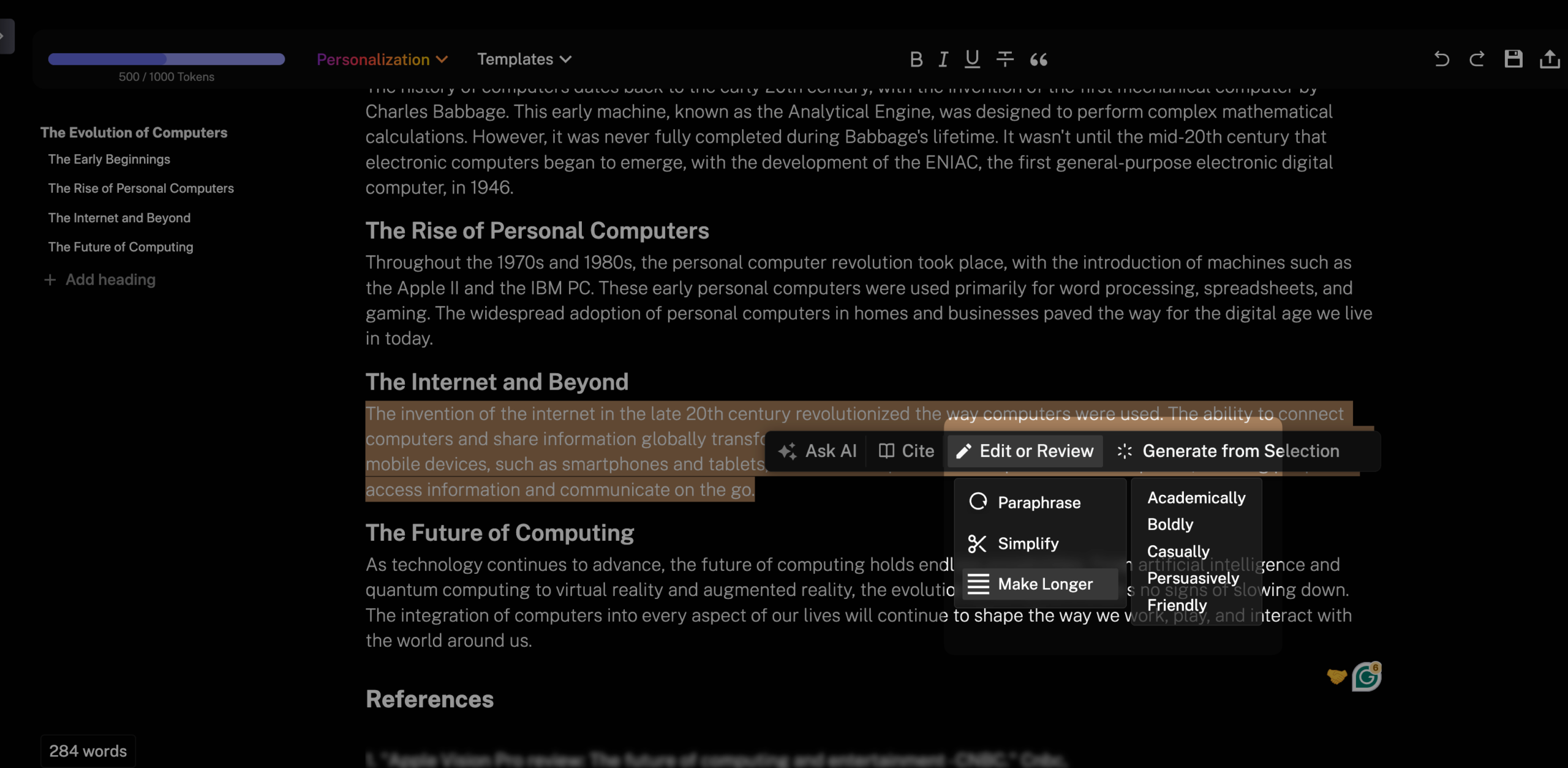 Sometimes, when working on academic papers or essays, you may find yourself struggling to meet word count requirements or fully develop your ideas. That’s where Conch AI shines as an essay expander. By analyzing your existing content, it can suggest additional information, examples, or arguments to help you expand your essay and provide a comprehensive analysis of the topic. With its AI-powered capabilities, Conch AI can aid in making your essays more compelling and well-rounded.