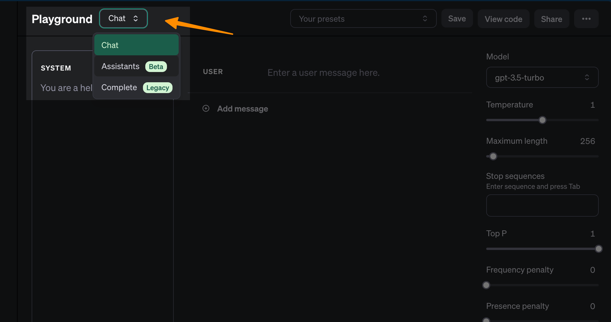 Upon logging into OpenAI Playground, you’ll find yourself faced with a choice between different modes of interaction with the AI.