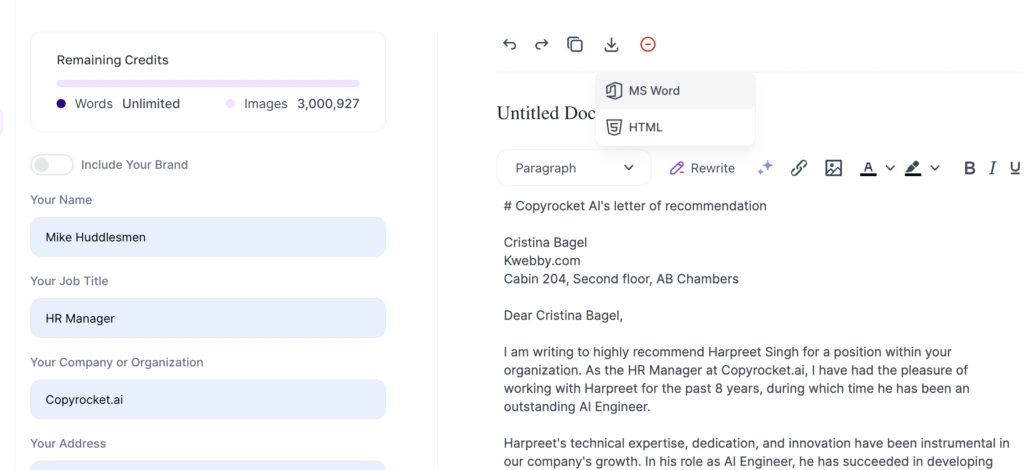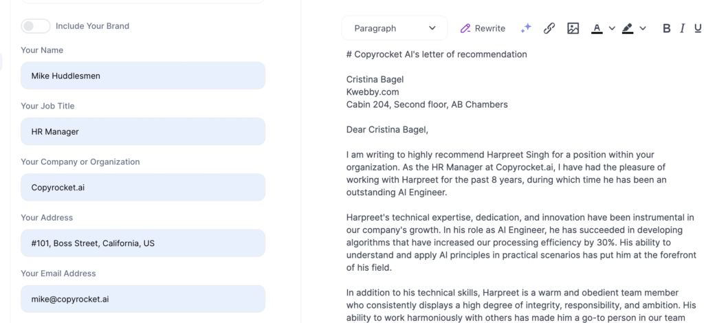 By following these steps, you can harness the power of Copyrocket AI to produce a strong, personalized, and professional recommendation letter.