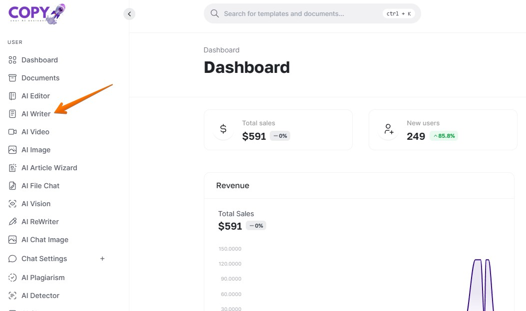 Access AI Writer: Once signed in, go to your dashboard and select the AI writer from the left-hand menu. This online editor is your gateway to leveraging AI for presentation creation.