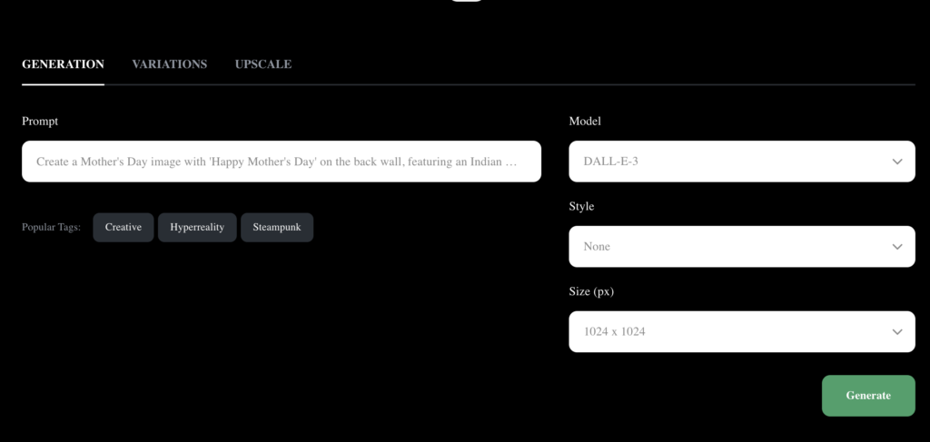- Generate Your Image: Once you’ve input all the necessary details, click on the ‘Generate’ button. The AI will then start creating your Mother’s Day image based on the prompt you’ve provided.