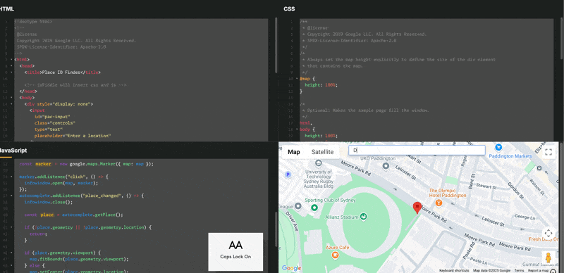 - Detailed Place Information: Displays key details such as the Place ID, name, and formatted address for the selected location.