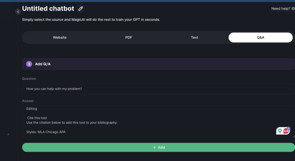 Initiate the Training Process: Once your Q&A data is in place, proceed by clicking the “train GPT button”, initiating the tailored training of your LLM based on your specific questions and answers.