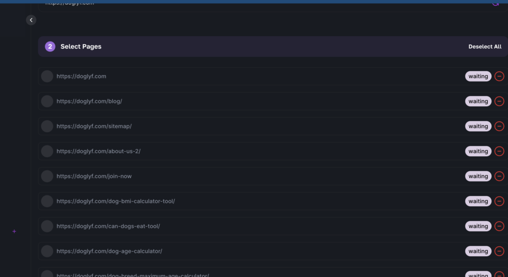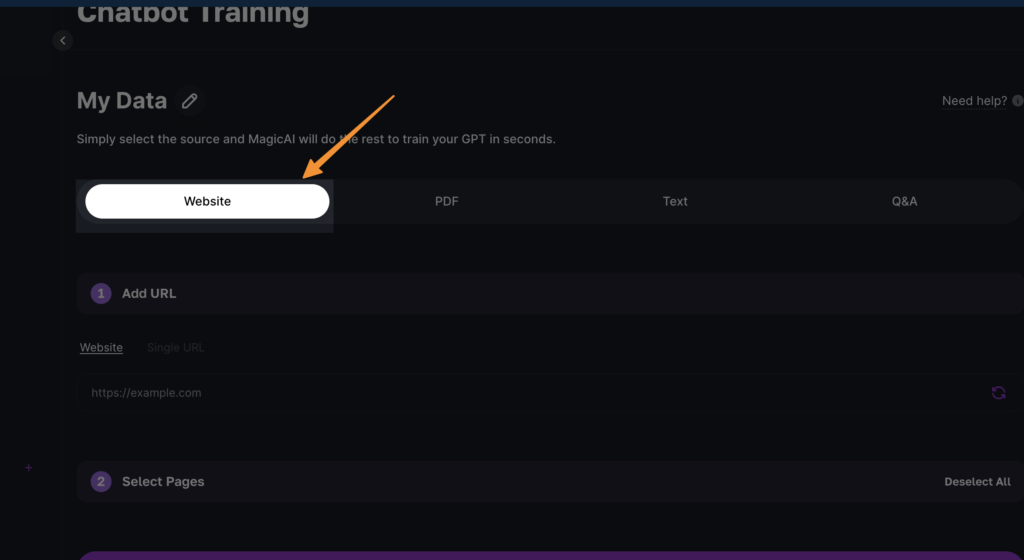 Select URLs for Training: Once the system has scraped your website, review and select all URLs you wish to include in the training process. Be selective to ensure the data is relevant to the LLM’s intended task.