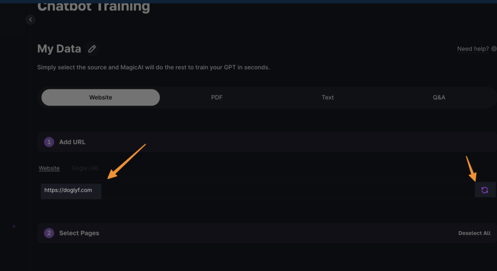 Select Website Data Ingestion Method: You will see four methods for data ingestion. Since we’re focusing on website content, click on “website” (note: this is for multiple pages, not a single page) and then click the reload button next to it. This action instructs the system to start scraping your website pages for training data.