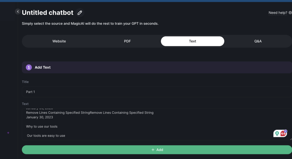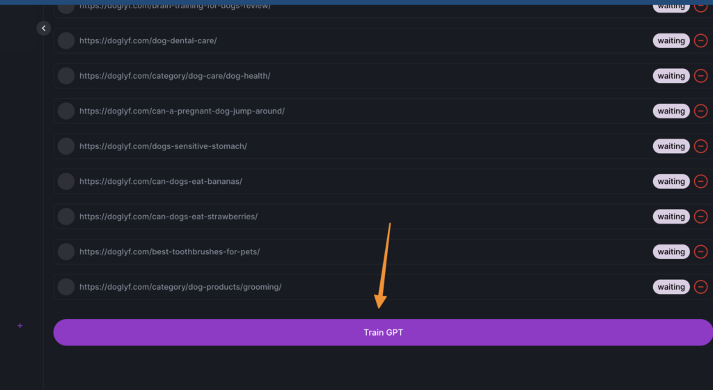 Initiate LLM Training: After selecting the necessary URLs, click on the “train GPT button.” This begins the process of training your custom LLM with the data obtained from your website. The system’s algorithms will start learning from your content, adapting the AI model to better serve your specific domain and task.