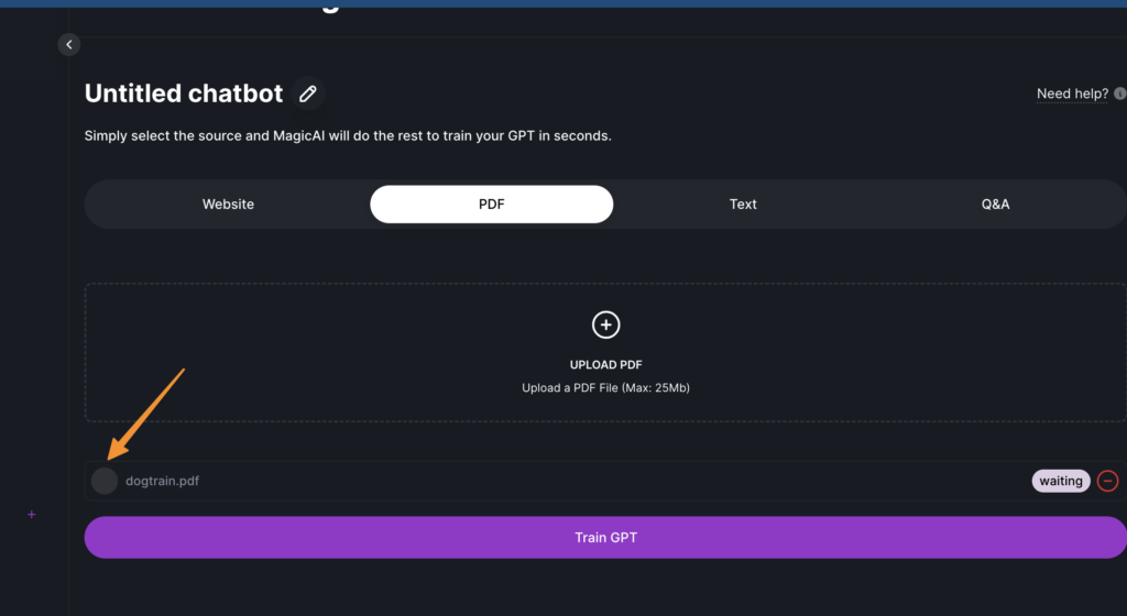 Initiate the Training Process: With your PDF file(s) uploaded, click on the “train GPT button”. This will start training your custom LLM using the text extracted from the PDF documents. The system employs advanced machine learning and natural language processing techniques to learn from the data provided in your PDFs.