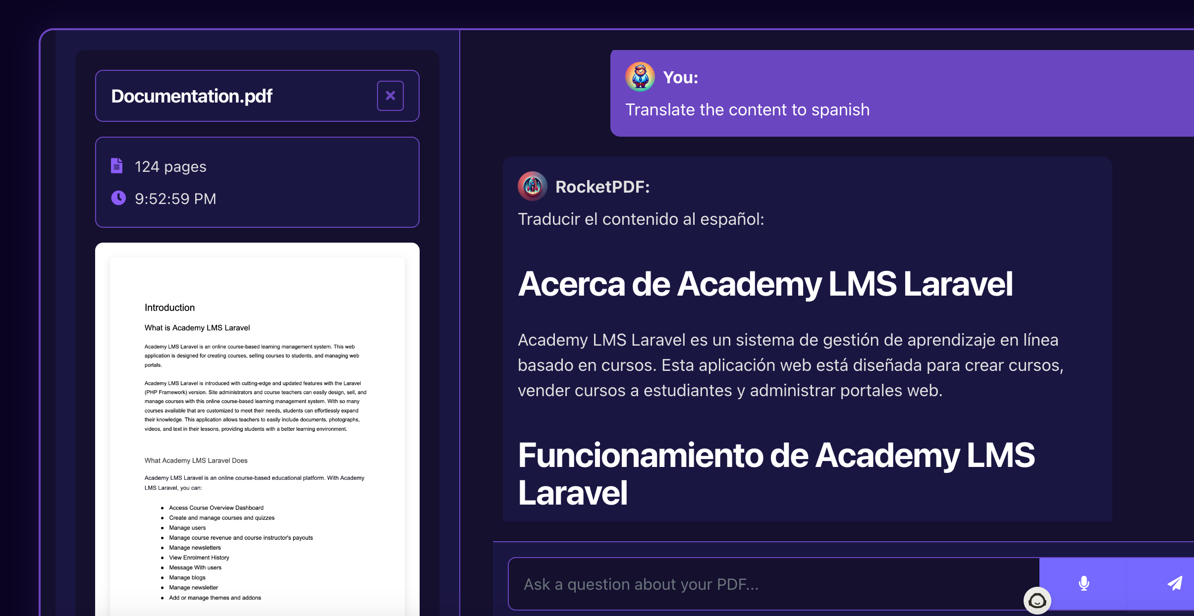 Wait for the AI to process your document. Once the PDF translation system is ready, you can start asking questions. For instance, if you want the content to be translated into your native language, simply start typing your queries in your preferred language (e.g., Spanish, French, or German). The tool will respond in the language you choose, allowing real-time interaction.