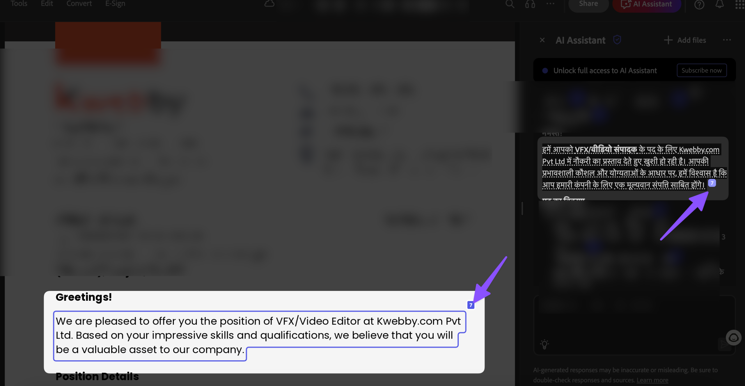Type the command “Translate the document in [your-language]” into the AI Assistant. Replace `[your-language]` with your target language, such as French, Spanish, or German.