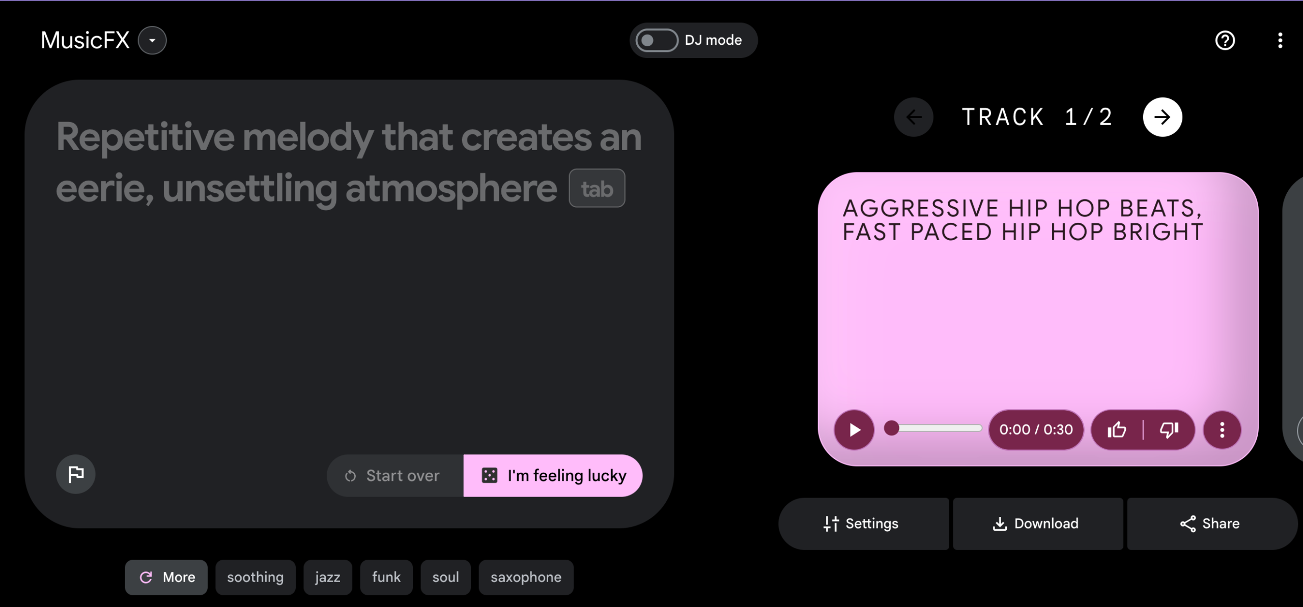 It could be as simple and evocative as “Aggressive hip hop beats”. This is where you start creating music that resonates with your personal style using Google MusicFX.