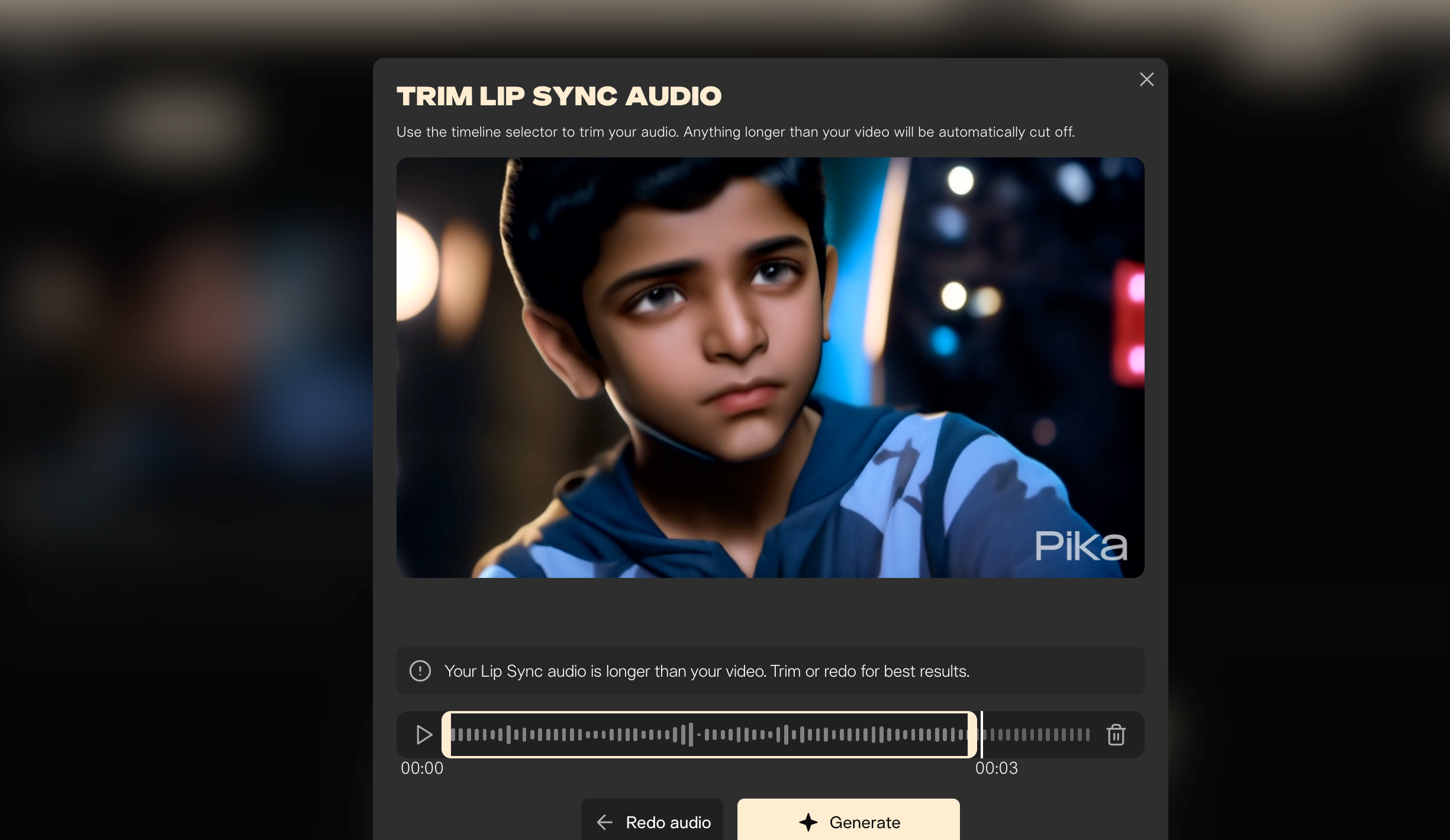 Once you’ve uploaded your voice file or created an AI voiceover, click on the “Generate” button. Pika AI will then prompt you to adjust your VoiceOver length if it exceeds 4 seconds.