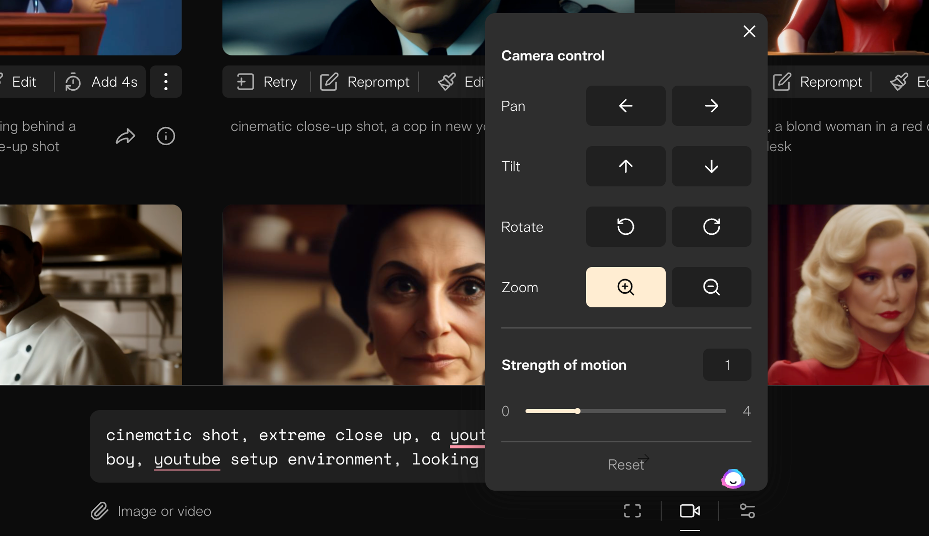 Motion Controls: Enhance your video with dynamic camera movements such as pan, tilt, rotate, and zoom. Adjust the strength of motion to match the energy of your scene.