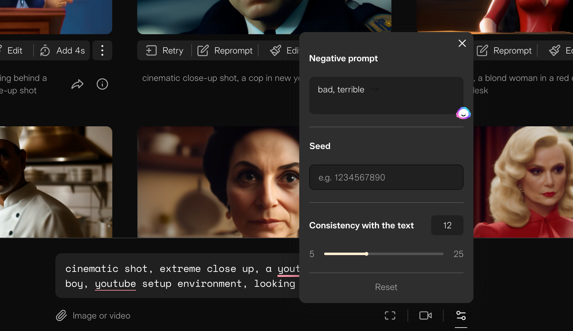 Seed and Consistency: Ensure thematic consistency by adjusting settings from 0 to 25, influencing how closely the generated videos adhere to your text prompt.