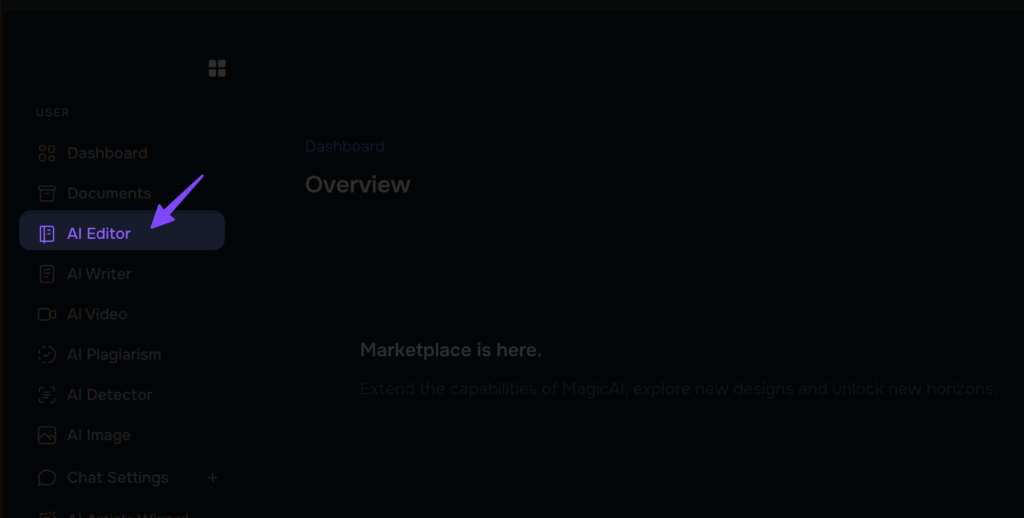 - Open the AI Editor: From the menu on the left, select the AI Editor option to begin working on your content.