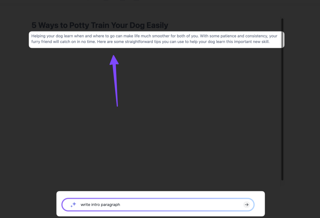 - Generate Content: Using the chat box, type what you want to generate. For example, write “write introduction paragraph” to allow the AI to scan previous content and generate an NLP-friendly introduction.